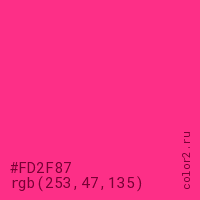 Цвет #FD2F87 в цветовой модели RGB обозначается тремя октетами (253, 47, 135) в десятичном формате и #FD2F87 в шестнадцатиричном (hex) формате, которые являются интенсивностью красного 253 (hex FD), интенсивность зелёного 47 (hex 2F) и интенсивность синего 135 (hex 87).
