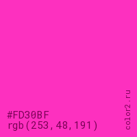 Цвет #FD30BF в цветовой модели RGB обозначается тремя октетами (253, 48, 191) в десятичном формате и #FD30BF в шестнадцатиричном (hex) формате, которые являются интенсивностью красного 253 (hex FD), интенсивность зелёного 48 (hex 30) и интенсивность синего 191 (hex BF).
