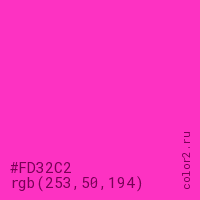 Цвет #FD32C2 в цветовой модели RGB обозначается тремя октетами (253, 50, 194) в десятичном формате и #FD32C2 в шестнадцатиричном (hex) формате, которые являются интенсивностью красного 253 (hex FD), интенсивность зелёного 50 (hex 32) и интенсивность синего 194 (hex C2).