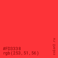 Цвет #FD3338 в цветовой модели RGB обозначается тремя октетами (253, 51, 56) в десятичном формате и #FD3338 в шестнадцатиричном (hex) формате, которые являются интенсивностью красного 253 (hex FD), интенсивность зелёного 51 (hex 33) и интенсивность синего 56 (hex 38).
