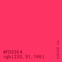 Цвет #FD3364 в цветовой модели RGB обозначается тремя октетами (253, 51, 100) в десятичном формате и #FD3364 в шестнадцатиричном (hex) формате, которые являются интенсивностью красного 253 (hex FD), интенсивность зелёного 51 (hex 33) и интенсивность синего 100 (hex 64).