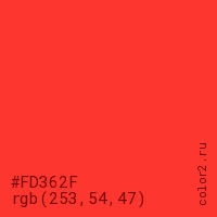 Цвет #FD362F в цветовой модели RGB обозначается тремя октетами (253, 54, 47) в десятичном формате и #FD362F в шестнадцатиричном (hex) формате, которые являются интенсивностью красного 253 (hex FD), интенсивность зелёного 54 (hex 36) и интенсивность синего 47 (hex 2F).