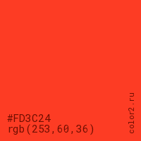 Цвет #FD3C24 в цветовой модели RGB обозначается тремя октетами (253, 60, 36) в десятичном формате и #FD3C24 в шестнадцатиричном (hex) формате, которые являются интенсивностью красного 253 (hex FD), интенсивность зелёного 60 (hex 3C) и интенсивность синего 36 (hex 24).