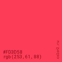 Цвет #FD3D58 в цветовой модели RGB обозначается тремя октетами (253, 61, 88) в десятичном формате и #FD3D58 в шестнадцатиричном (hex) формате, которые являются интенсивностью красного 253 (hex FD), интенсивность зелёного 61 (hex 3D) и интенсивность синего 88 (hex 58).