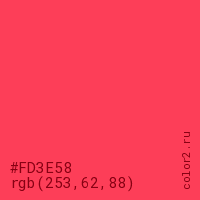 Цвет #FD3E58 в цветовой модели RGB обозначается тремя октетами (253, 62, 88) в десятичном формате и #FD3E58 в шестнадцатиричном (hex) формате, которые являются интенсивностью красного 253 (hex FD), интенсивность зелёного 62 (hex 3E) и интенсивность синего 88 (hex 58).