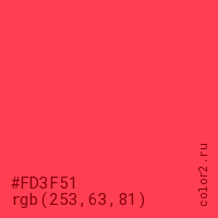 Цвет #FD3F51 в цветовой модели RGB обозначается тремя октетами (253, 63, 81) в десятичном формате и #FD3F51 в шестнадцатиричном (hex) формате, которые являются интенсивностью красного 253 (hex FD), интенсивность зелёного 63 (hex 3F) и интенсивность синего 81 (hex 51).