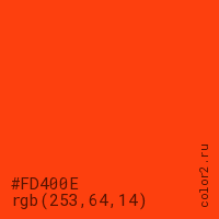 Цвет #FD400E в цветовой модели RGB обозначается тремя октетами (253, 64, 14) в десятичном формате и #FD400E в шестнадцатиричном (hex) формате, которые являются интенсивностью красного 253 (hex FD), интенсивность зелёного 64 (hex 40) и интенсивность синего 14 (hex 0E).