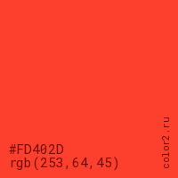 Цвет #FD402D в цветовой модели RGB обозначается тремя октетами (253, 64, 45) в десятичном формате и #FD402D в шестнадцатиричном (hex) формате, которые являются интенсивностью красного 253 (hex FD), интенсивность зелёного 64 (hex 40) и интенсивность синего 45 (hex 2D).
