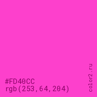 Цвет #FD40CC в цветовой модели RGB обозначается тремя октетами (253, 64, 204) в десятичном формате и #FD40CC в шестнадцатиричном (hex) формате, которые являются интенсивностью красного 253 (hex FD), интенсивность зелёного 64 (hex 40) и интенсивность синего 204 (hex CC).