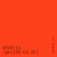 Цвет #FD411A в цветовой модели RGB обозначается тремя октетами (253, 65, 26) в десятичном формате и #FD411A в шестнадцатиричном (hex) формате, которые являются интенсивностью красного 253 (hex FD), интенсивность зелёного 65 (hex 41) и интенсивность синего 26 (hex 1A).
