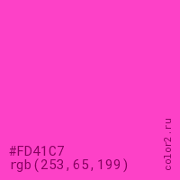 Цвет #FD41C7 в цветовой модели RGB обозначается тремя октетами (253, 65, 199) в десятичном формате и #FD41C7 в шестнадцатиричном (hex) формате, которые являются интенсивностью красного 253 (hex FD), интенсивность зелёного 65 (hex 41) и интенсивность синего 199 (hex C7).