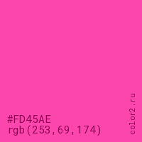 Цвет #FD45AE в цветовой модели RGB обозначается тремя октетами (253, 69, 174) в десятичном формате и #FD45AE в шестнадцатиричном (hex) формате, которые являются интенсивностью красного 253 (hex FD), интенсивность зелёного 69 (hex 45) и интенсивность синего 174 (hex AE).