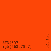 Цвет #FD4607 в цветовой модели RGB обозначается тремя октетами (253, 70, 7) в десятичном формате и #FD4607 в шестнадцатиричном (hex) формате, которые являются интенсивностью красного 253 (hex FD), интенсивность зелёного 70 (hex 46) и интенсивность синего 7 (hex 07).