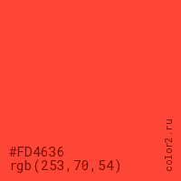 Цвет #FD4636 в цветовой модели RGB обозначается тремя октетами (253, 70, 54) в десятичном формате и #FD4636 в шестнадцатиричном (hex) формате, которые являются интенсивностью красного 253 (hex FD), интенсивность зелёного 70 (hex 46) и интенсивность синего 54 (hex 36).