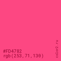 Цвет #FD4782 в цветовой модели RGB обозначается тремя октетами (253, 71, 130) в десятичном формате и #FD4782 в шестнадцатиричном (hex) формате, которые являются интенсивностью красного 253 (hex FD), интенсивность зелёного 71 (hex 47) и интенсивность синего 130 (hex 82).