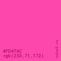 Цвет #FD47AC в цветовой модели RGB обозначается тремя октетами (253, 71, 172) в десятичном формате и #FD47AC в шестнадцатиричном (hex) формате, которые являются интенсивностью красного 253 (hex FD), интенсивность зелёного 71 (hex 47) и интенсивность синего 172 (hex AC).
