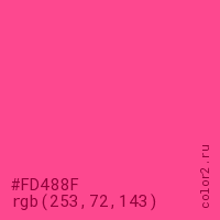 Цвет #FD488F в цветовой модели RGB обозначается тремя октетами (253, 72, 143) в десятичном формате и #FD488F в шестнадцатиричном (hex) формате, которые являются интенсивностью красного 253 (hex FD), интенсивность зелёного 72 (hex 48) и интенсивность синего 143 (hex 8F).