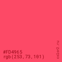 Цвет #FD4965 в цветовой модели RGB обозначается тремя октетами (253, 73, 101) в десятичном формате и #FD4965 в шестнадцатиричном (hex) формате, которые являются интенсивностью красного 253 (hex FD), интенсивность зелёного 73 (hex 49) и интенсивность синего 101 (hex 65).