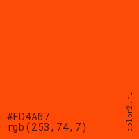 Цвет #FD4A07 в цветовой модели RGB обозначается тремя октетами (253, 74, 7) в десятичном формате и #FD4A07 в шестнадцатиричном (hex) формате, которые являются интенсивностью красного 253 (hex FD), интенсивность зелёного 74 (hex 4A) и интенсивность синего 7 (hex 07).