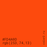 Цвет #FD4A0D в цветовой модели RGB обозначается тремя октетами (253, 74, 13) в десятичном формате и #FD4A0D в шестнадцатиричном (hex) формате, которые являются интенсивностью красного 253 (hex FD), интенсивность зелёного 74 (hex 4A) и интенсивность синего 13 (hex 0D).