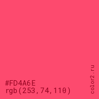 Цвет #FD4A6E в цветовой модели RGB обозначается тремя октетами (253, 74, 110) в десятичном формате и #FD4A6E в шестнадцатиричном (hex) формате, которые являются интенсивностью красного 253 (hex FD), интенсивность зелёного 74 (hex 4A) и интенсивность синего 110 (hex 6E).