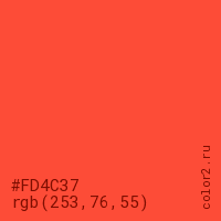 Цвет #FD4C37 в цветовой модели RGB обозначается тремя октетами (253, 76, 55) в десятичном формате и #FD4C37 в шестнадцатиричном (hex) формате, которые являются интенсивностью красного 253 (hex FD), интенсивность зелёного 76 (hex 4C) и интенсивность синего 55 (hex 37).