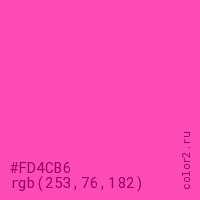 Цвет #FD4CB6 в цветовой модели RGB обозначается тремя октетами (253, 76, 182) в десятичном формате и #FD4CB6 в шестнадцатиричном (hex) формате, которые являются интенсивностью красного 253 (hex FD), интенсивность зелёного 76 (hex 4C) и интенсивность синего 182 (hex B6).