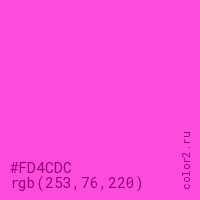 Цвет #FD4CDC в цветовой модели RGB обозначается тремя октетами (253, 76, 220) в десятичном формате и #FD4CDC в шестнадцатиричном (hex) формате, которые являются интенсивностью красного 253 (hex FD), интенсивность зелёного 76 (hex 4C) и интенсивность синего 220 (hex DC).