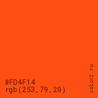 Цвет #FD4F14 в цветовой модели RGB обозначается тремя октетами (253, 79, 20) в десятичном формате и #FD4F14 в шестнадцатиричном (hex) формате, которые являются интенсивностью красного 253 (hex FD), интенсивность зелёного 79 (hex 4F) и интенсивность синего 20 (hex 14).