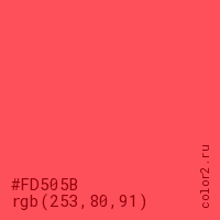 Цвет #FD505B в цветовой модели RGB обозначается тремя октетами (253, 80, 91) в десятичном формате и #FD505B в шестнадцатиричном (hex) формате, которые являются интенсивностью красного 253 (hex FD), интенсивность зелёного 80 (hex 50) и интенсивность синего 91 (hex 5B).