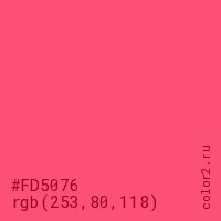 Цвет #FD5076 в цветовой модели RGB обозначается тремя октетами (253, 80, 118) в десятичном формате и #FD5076 в шестнадцатиричном (hex) формате, которые являются интенсивностью красного 253 (hex FD), интенсивность зелёного 80 (hex 50) и интенсивность синего 118 (hex 76).