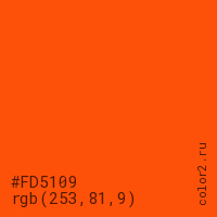 Цвет #FD5109 в цветовой модели RGB обозначается тремя октетами (253, 81, 9) в десятичном формате и #FD5109 в шестнадцатиричном (hex) формате, которые являются интенсивностью красного 253 (hex FD), интенсивность зелёного 81 (hex 51) и интенсивность синего 9 (hex 09).