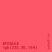 Цвет #FD5668 в цветовой модели RGB обозначается тремя октетами (253, 86, 104) в десятичном формате и #FD5668 в шестнадцатиричном (hex) формате, которые являются интенсивностью красного 253 (hex FD), интенсивность зелёного 86 (hex 56) и интенсивность синего 104 (hex 68).