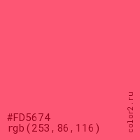 Цвет #FD5674 в цветовой модели RGB обозначается тремя октетами (253, 86, 116) в десятичном формате и #FD5674 в шестнадцатиричном (hex) формате, которые являются интенсивностью красного 253 (hex FD), интенсивность зелёного 86 (hex 56) и интенсивность синего 116 (hex 74).