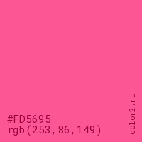 Цвет #FD5695 в цветовой модели RGB обозначается тремя октетами (253, 86, 149) в десятичном формате и #FD5695 в шестнадцатиричном (hex) формате, которые являются интенсивностью красного 253 (hex FD), интенсивность зелёного 86 (hex 56) и интенсивность синего 149 (hex 95).