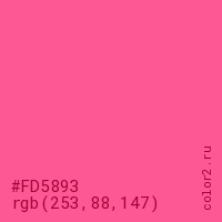 Цвет #FD5893 в цветовой модели RGB обозначается тремя октетами (253, 88, 147) в десятичном формате и #FD5893 в шестнадцатиричном (hex) формате, которые являются интенсивностью красного 253 (hex FD), интенсивность зелёного 88 (hex 58) и интенсивность синего 147 (hex 93).