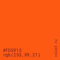 Цвет #FD5915 в цветовой модели RGB обозначается тремя октетами (253, 89, 21) в десятичном формате и #FD5915 в шестнадцатиричном (hex) формате, которые являются интенсивностью красного 253 (hex FD), интенсивность зелёного 89 (hex 59) и интенсивность синего 21 (hex 15).