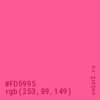Цвет #FD5995 в цветовой модели RGB обозначается тремя октетами (253, 89, 149) в десятичном формате и #FD5995 в шестнадцатиричном (hex) формате, которые являются интенсивностью красного 253 (hex FD), интенсивность зелёного 89 (hex 59) и интенсивность синего 149 (hex 95).