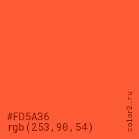 Цвет #FD5A36 в цветовой модели RGB обозначается тремя октетами (253, 90, 54) в десятичном формате и #FD5A36 в шестнадцатиричном (hex) формате, которые являются интенсивностью красного 253 (hex FD), интенсивность зелёного 90 (hex 5A) и интенсивность синего 54 (hex 36).