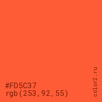 Цвет #FD5C37 в цветовой модели RGB обозначается тремя октетами (253, 92, 55) в десятичном формате и #FD5C37 в шестнадцатиричном (hex) формате, которые являются интенсивностью красного 253 (hex FD), интенсивность зелёного 92 (hex 5C) и интенсивность синего 55 (hex 37).