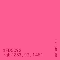 Цвет #FD5C92 в цветовой модели RGB обозначается тремя октетами (253, 92, 146) в десятичном формате и #FD5C92 в шестнадцатиричном (hex) формате, которые являются интенсивностью красного 253 (hex FD), интенсивность зелёного 92 (hex 5C) и интенсивность синего 146 (hex 92).