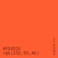 Цвет #FD5D2E в цветовой модели RGB обозначается тремя октетами (253, 93, 46) в десятичном формате и #FD5D2E в шестнадцатиричном (hex) формате, которые являются интенсивностью красного 253 (hex FD), интенсивность зелёного 93 (hex 5D) и интенсивность синего 46 (hex 2E).