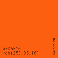 Цвет #FD5F10 в цветовой модели RGB обозначается тремя октетами (253, 95, 16) в десятичном формате и #FD5F10 в шестнадцатиричном (hex) формате, которые являются интенсивностью красного 253 (hex FD), интенсивность зелёного 95 (hex 5F) и интенсивность синего 16 (hex 10).