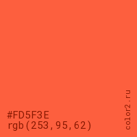 Цвет #FD5F3E в цветовой модели RGB обозначается тремя октетами (253, 95, 62) в десятичном формате и #FD5F3E в шестнадцатиричном (hex) формате, которые являются интенсивностью красного 253 (hex FD), интенсивность зелёного 95 (hex 5F) и интенсивность синего 62 (hex 3E).