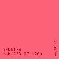 Цвет #FD6178 в цветовой модели RGB обозначается тремя октетами (253, 97, 120) в десятичном формате и #FD6178 в шестнадцатиричном (hex) формате, которые являются интенсивностью красного 253 (hex FD), интенсивность зелёного 97 (hex 61) и интенсивность синего 120 (hex 78).