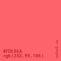 Цвет #FD636A в цветовой модели RGB обозначается тремя октетами (253, 99, 106) в десятичном формате и #FD636A в шестнадцатиричном (hex) формате, которые являются интенсивностью красного 253 (hex FD), интенсивность зелёного 99 (hex 63) и интенсивность синего 106 (hex 6A).