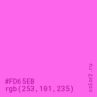 Цвет #FD65EB в цветовой модели RGB обозначается тремя октетами (253, 101, 235) в десятичном формате и #FD65EB в шестнадцатиричном (hex) формате, которые являются интенсивностью красного 253 (hex FD), интенсивность зелёного 101 (hex 65) и интенсивность синего 235 (hex EB).