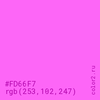 Цвет #FD66F7 в цветовой модели RGB обозначается тремя октетами (253, 102, 247) в десятичном формате и #FD66F7 в шестнадцатиричном (hex) формате, которые являются интенсивностью красного 253 (hex FD), интенсивность зелёного 102 (hex 66) и интенсивность синего 247 (hex F7).