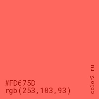 Цвет #FD675D в цветовой модели RGB обозначается тремя октетами (253, 103, 93) в десятичном формате и #FD675D в шестнадцатиричном (hex) формате, которые являются интенсивностью красного 253 (hex FD), интенсивность зелёного 103 (hex 67) и интенсивность синего 93 (hex 5D).