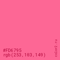 Цвет #FD6795 в цветовой модели RGB обозначается тремя октетами (253, 103, 149) в десятичном формате и #FD6795 в шестнадцатиричном (hex) формате, которые являются интенсивностью красного 253 (hex FD), интенсивность зелёного 103 (hex 67) и интенсивность синего 149 (hex 95).